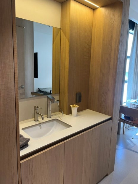 침대 옆에 옷장과 냉장고, 세면대에 세안도구가 있고